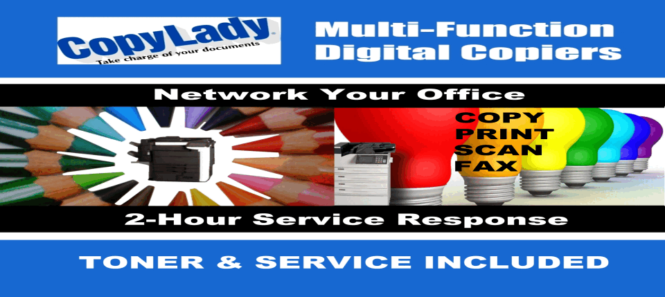 CopyLady: Proudly serving Naples, Bonita Springs, and SouthWest Florida since 2002!Let CopyLady take your business to the next level of document management!At CopyLady, We carry Multifunction Printers from major brands such as Epson, Kyocera, and KIP.We also service other major brands, such as HP, OKI, Canon, Xerox, Brother, and Ricoh.Need a toner, ink or other component for an existing machine? Can't find it anywhere else? We can help you!CopyLady is the ONLY dealer in Florida with a 2-Hour service guarantee!When your copier runs into a problem, that can bring your business to a screeching halt. No one has time for downtime!With CopyLady's 2-Hour service guarantee, you can have confidence that your business will be back up and running in no time!Because we at CopyLady know that you cannot afford ANY downtime, We make sure that your copier stays in tip-top running shape. Our team of highly trained copier technicians are always ready to help when the call comes in, You can also get quick assistance fromour help desk! Do you have a question about something on your copier or printer? Need some assistance with a feature? Just give CopyLadya call, and our highly knowledgeable help desk technicians can assist you within minutes!. Worried about toner costs? We got you covered!Gone are the days of having to take up space in your office with a stock of toner. With CopyLady's revolutionary Toner Replenishment System (TRS),You will never have to worry about being out of toner, or having to take time out of your busy day to call for toner. Once TRS tells us you are low on a toner, One of our technicians will simply deliver a fresh toner directly to your office. We carry a full selection of toners and inks in our Fort Myerswarehouse, so you NEVER have to wait for shipping!By the way, did we mention that this is included FREE with your CopyLady service agreement? Well, it is! NEVER pay for toners again!Need to print REALLY BIG? We can help you with that! Whether it's a poster, a banner, or even blueprints, let CopyLady get you set up with a plotter that will let you exceed your wildest creative ambitions! With sizes up to 44 inches, There's no limit to what you can create!Are you ready to take your productivity to the next level? What are you waiting for? Call us at 239-939-5383and let our experienced sales team set you up with the copier that YOUR business needs!Call CopyLady Today at 239-939-5383Serving Naples, Bonita Springs, and all of Southwest Florida.