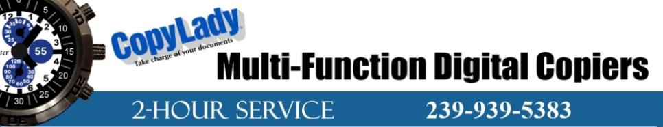 ProductsId qui et pariatur, in, culpa magna ex ea aute ipsum. Cynthia Duff - President & CEO CopyLady was founded in 2002 by Cynthia Duff as a document solutions provider to offer top quality,state-of-the-art multi-functional copiers, printers, scanners and facsimiles. With over twenty years ofdocument management experience, she created CopyLady to provide top of the line digital documentsolutions for offices in Southwest Florida. She successfully created Copylady’s best Two-Hour ServiceResponse for businesses to have their copiers running smoothly and efficiently. She made it possiblefor offices to have the best service with their equipment that no other copier company provided. Cynthia knew that multi-function digital copiers were something that all businesses needed to processtheir documents efficiently and effectively. CopyLady now carries and delivers the latest, mostadvanced digital solutions for multi-functional office copiers. CopyLady proudly provides totaldocument solutions for copying, printing, scanning and facsimile functions all in one package.CopyLady’s home page can be visited at www.CopyLady.com. Cynthia is involved in numerous community events, sponsorships and organizations. She is on the board of directors of the SouthwestFlorida Symphony. She supports The Rotary Club of Fort Myers, Southwest Florida Community Foundation, Southwest Florida CommunityFoundation, The Salvation Army, The Honorable Order of Kentucky Colonels, The Greater Fort Myers Chamber of Commerce and theHispanic Chamber of Commerce.Dan Detrick - Vice President & CFO Dan Detrick is Vice President and CEO of CopyLady. He has an extensive background inManagement and Communications. His knowledge and previous background experience allow him tosuccessfully select and deliver top of the line technology for our customers. He chooses the best nationwidevendors to provide equipment and supplies for CopyLady to offer our clients the most advanceddigital copiers, including printers, digital scanners and facsimile products in the industry. Dan heads CopyLady’s Operations Department to bring our customers quality products, along withthe best service in all of Southwest Florida. He also directs CopyLady’s Purchasing, Sales and ServiceDepartments. He positions CopyLady to successfully deliver the best office equipment products andthe best customer service for all of our equipment leases, rentals and sales. Dan graduated from Florida State University majoring in Business Psychology and minoringin Business Communications. Nancy Iler - Director Sales & Marketing Nancy Iler is CopyLady’s Director of Sales and Document Solution Marketing Department. She providesconsultation of the latest document management solutions that CopyLady has to offer. She partners withbusinesses and IT departments providing them with the latest, most advanced avenues to streamlinetheir document management needs. Having a background in the Sales & Marketing Industry for a number of years, she provides businesseswith options for better, more advanced ways for offices to process their documents in a faster, moreaffordable way. Being an office equipment consultant, Nancy offers businesses digital informationtechnology solutions by choosing the best state-of-the-art equipment to meet document managementneeds. Nancy attends our tradeshows and conventions representing CopyLady’s full line of digital officeequipment products here in Southwest Florida.Carol Adams - Director Customer Service Carol Adams is our Customer Service Department Director. She has years of experience in CustomerService and efficiently provides our clients with the fastest, most efficient service possible. Herfriendly, professional and helpful personality allow her to successfully deliver the best service forour clients. Her concern for servicing customers allow her to provide the most excellent service forour customers and their copier needs. Carol makes customer service CopyLady’s priority and communicates client needs to CopyLady’sservice department to resolve client issues and needs. Putting customer service needs first, she allowsCopyLady to expedite the best service for our copiers and client requirements. Carol’s philosophy is for every client to be a satisfied client. She goes out of her way to resolveissues that any office may have which is what makes CopyLady successful. Quality Products, Professional Service, Competitive Pricing Visit our Home Page at www.CopyLady.comwww.CopyLady.comCopyLady Sales, Leasing and Service of Multi-Function Digital Copiers for Naples and Bonita Springs, Florida. View our website for a complete listing of copy machines and office equipment at www.CopyLady.com.